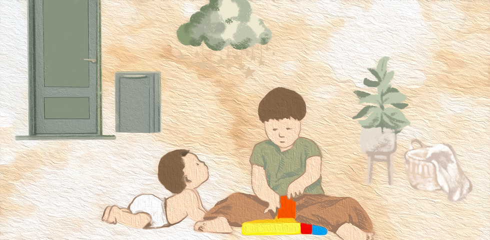 (兩個小孩在玩積木,很乖巧的樣子,家具乍看之下也沒有什麼異常。)